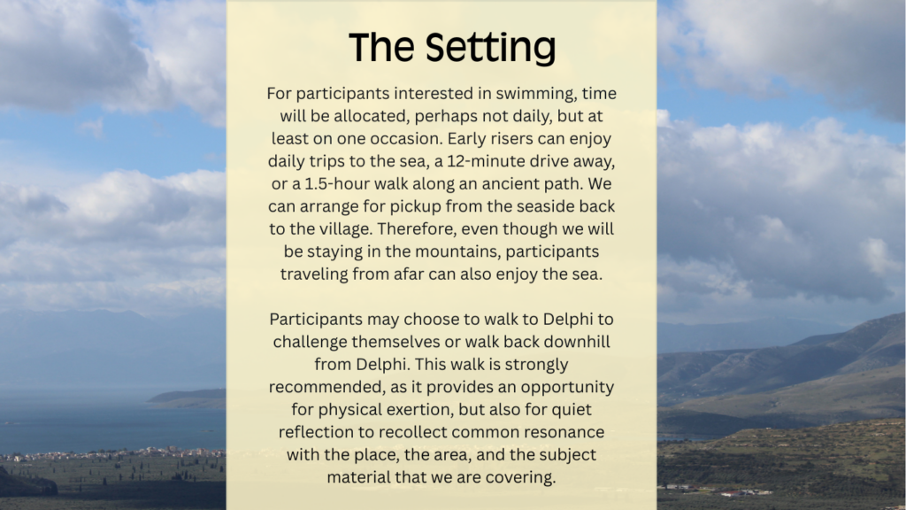 For the remainder of the seminar, we will visit the Delphi site and hold sessions in the seminar room, where we will conduct family constellations. Mythical constellations, guided by resonance, will address the curriculum. While the subject matter is substantial, time and space will be available for physical activity.