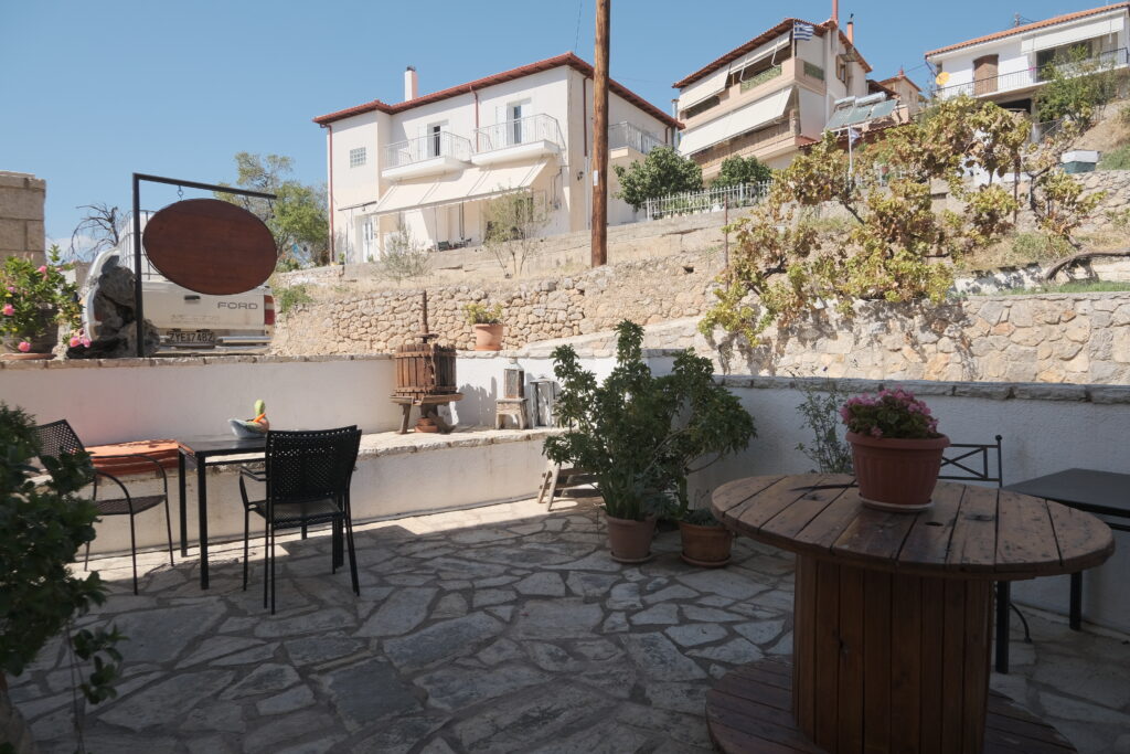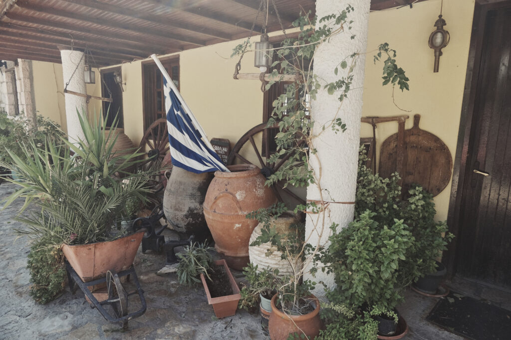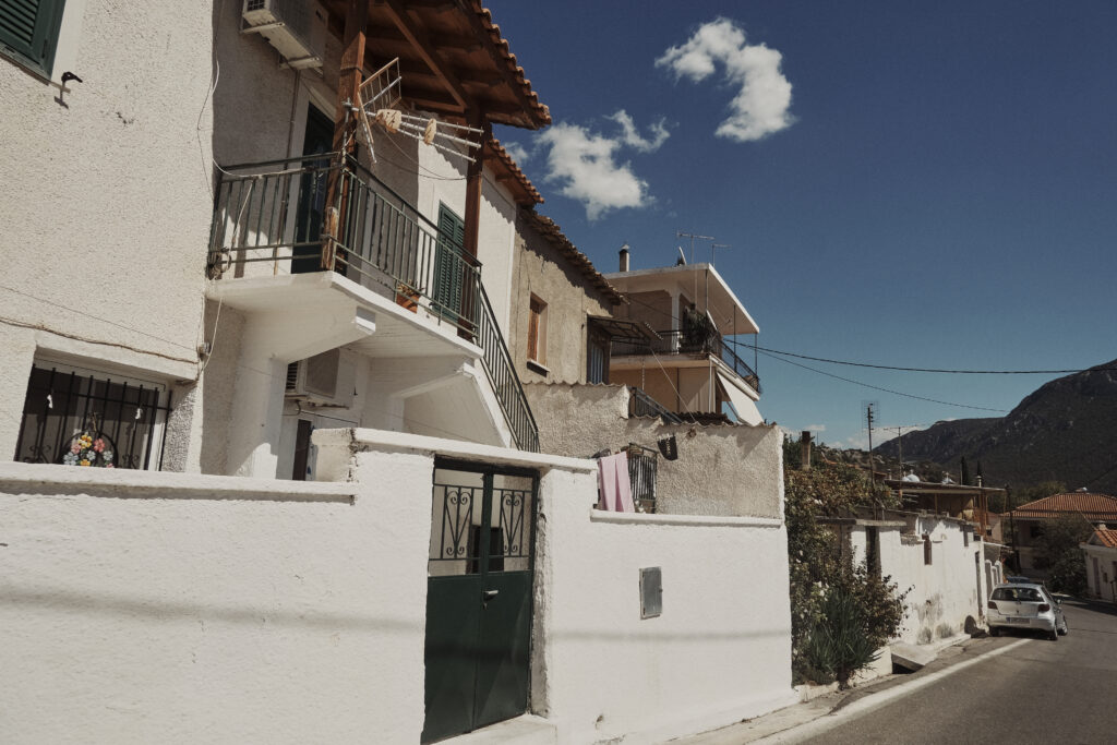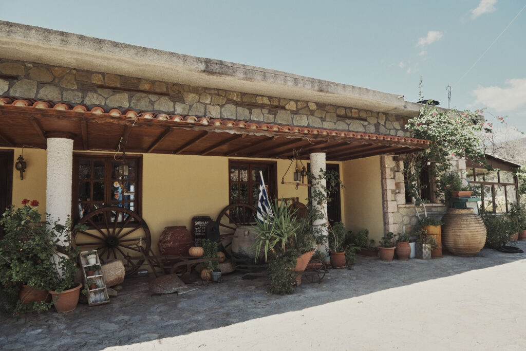Interestingly, just an 11-minute drive from the ancient site lies a village that has remained of the beaten path. It is designated as a Greek cultural heritage site. The village features stone-paved roads and houses with traditional Greek color palettes: natural hues of green, beige, red, and blue. The architecture is traditional and diverse, spanning various historical periods. You’ll encounter everything from earth brick houses to stone dwellings constructed with local materials, and even see ancient Greek remnants integrated into newer walls, among other unexpected sights during our walks.